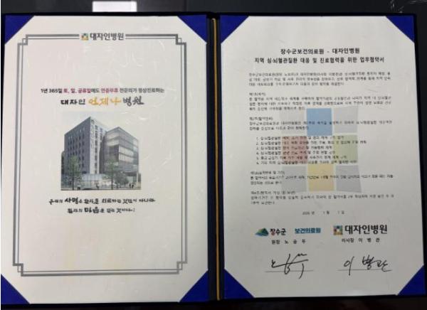 [한국제일신문, 김성관기자] 장수군은 대자인병원과 심뇌혈관질환 발생 시 신속하고 효과적인 대응을 위해 상호 진료협력 체계를 구축하는 ‘심뇌혈관질환 대응 진료협력 협약(MOU)’을 체결했다고 9일 밝혔다.