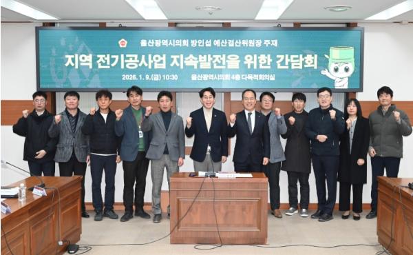 방인섭 울산광역시의회 예산결산위원장은 9일 오전 시의회 다목적회의실에서 한국전기공사협회 울산광역시회 회원업체 대표들과 ‘지역 전기공사업 지속 발전을 위한 간담회’를 열고, 전기공사 현장 애로사항 해소 및 제도 개선 방향을 논의했다.