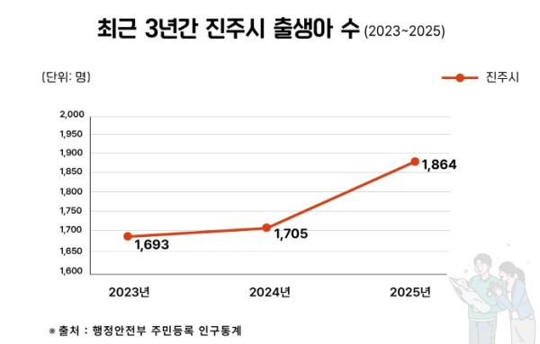 지난 5일 행정안전부의 주민등록 인구통계 발표에 따르면 진주시의 주민등록 출생아 수는 2023년 1693명으로 저점을 찍은 후, 2024년 1705명, 2025년 1864명으로 뚜렷한 증가세를 보였다.