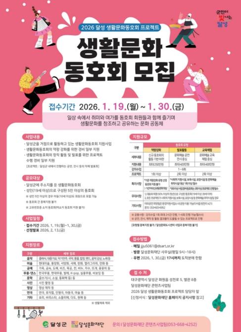 (재)달성문화재단은 1월 19일부터 30일까지 ‘2026 달성 생활문화동호회 프로젝트’에 참여할 동호회를 모집한다고 9일 밝혔다.