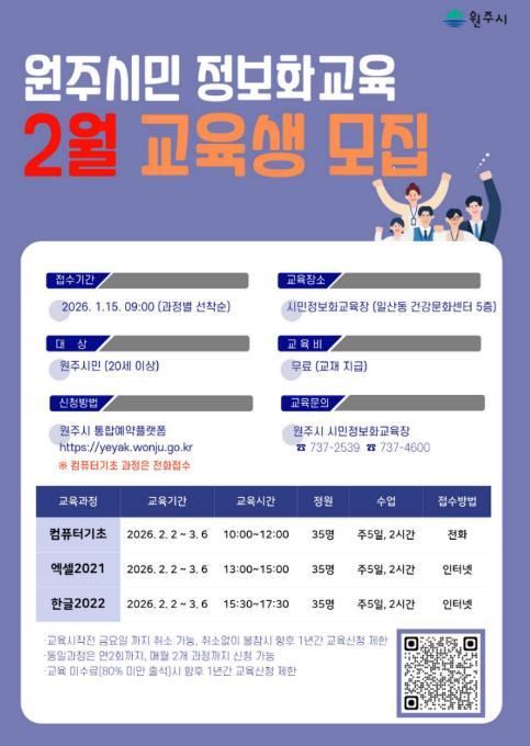 [한국제일신문, 김성광기자] 원주시는 시민들의 디지털 활용 능력 향상과 정보 격차 해소를 위해 시민정보화교육 2월 수강생을 모집한다.