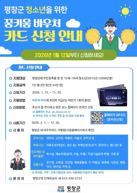 먼저, 청소년 꿈키움 바우처 카드 지원사업은 평창군에 주민등록을 둔 만 13세부터 18세까지의 청소년(2008년~2013년생)을 대상으로, 1인당 월 2만 원(연 24만 원)의 바우처 포인트를 지원하는 사업이다.