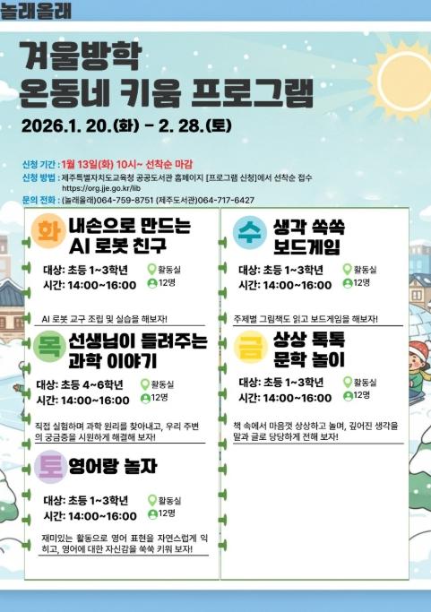 [한국제일신문, 김성옥기자] 제주도교육청 제주도서관은 겨울방학을 맞아 20일부터 2월 28일까지 초등학생들을 대상으로 ‘2026년 놀래올래 겨울방학 온동네 키움 프로그램’을 운영한다.