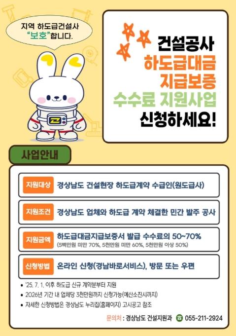 [한국제일신문, 김성옥기자] 경상남도가 건설 산업의 활력을 높이고 하도급 업체 보호하기 위해 ‘2026년 건설공사 하도급대금 지급보증 수수료 지원사업’을 확대 추진한다고 밝혔다.