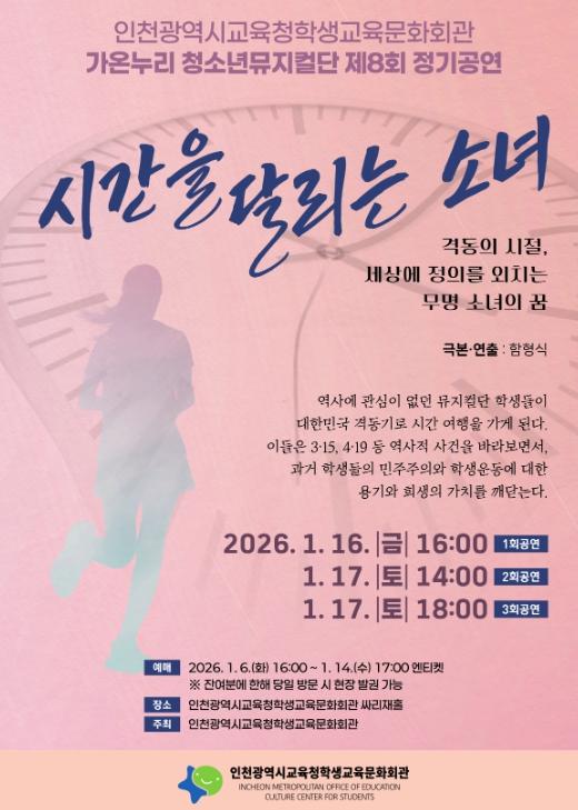 [한국제일신문, 김성옥기자] 인천광역시교육청학생교육문화회관은 가온누리 청소년뮤지컬단 제8회 정기공연 ‘시간을 달리는 소녀’를 16일부터 17일까지 싸리재홀 대공연장에서 개최한다.