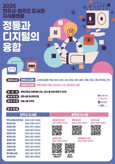 전주시는 지난 8일부터 오는 2월 5일까지 12개 시립도서관에서 전북대학교와 연계한 ‘전주시 도서관 지식플랫폼: 정통과 디지털의 융합’ 프로그램을 운영한다고 12일 밝혔다.