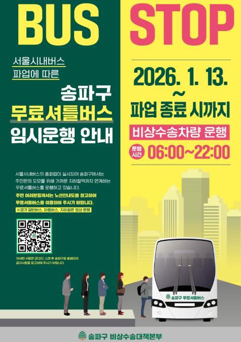 [한국제일신문, 김성옥기자] 송파구는 서울시버스노동조합이 오는 13일부터 총파업 돌입을 예고함에 따라 구민들의 교통 불편 최소화를 위해 무료 셔틀버스를 투입하는 등 '비상수송대책'을 가동한다고 밝혔다.
