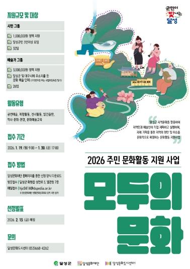 (재)달성문화재단 달성문화도시센터는 오는 30일까지 지역 주민과 예술가들의 문화활동 지원 사업 ‘모두의 문화’에 참여할 단체를 모집한다고 12일 밝혔다.