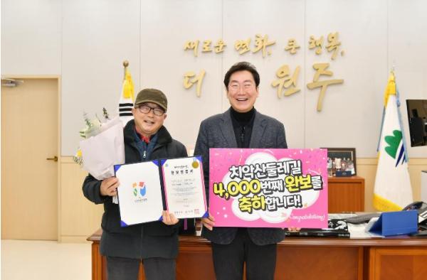[한국제일신문, 김성광기자] 원주 치악산둘레길 개통 이후 4년 7개월여 만에 4,000번째 전 구간 완보자가 탄생했다. 그 주인공은 손광락 씨다.