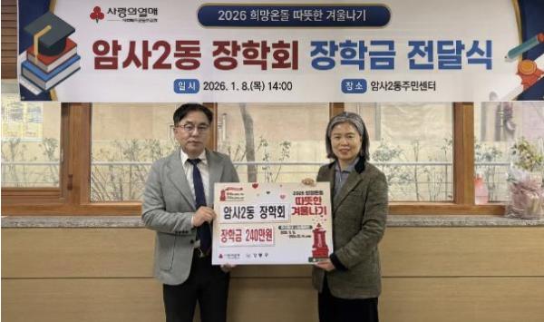 [한국제일신문, 김성옥기자] 강동구 암사2동은 지난 8일, ‘2026년 희망온돌 따뜻한 겨울나기’ 사업의 일환으로 ‘암사2동장학회 장학금 전달식’을 개최했다고 밝혔다.