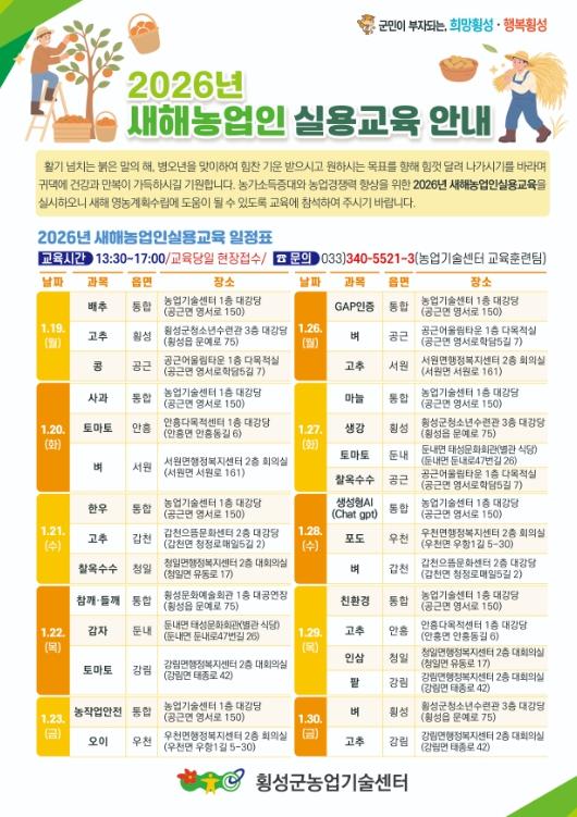 [한국제일신문, 김성광기자] 횡성군이 지역 농업인들의 성공적인 영농 계획 수립과 농업 경쟁력 강화를 위해 오는 1월 19일부터 30일까지 ‘2026년 새해 농업인 실용교육’을 실시한다.