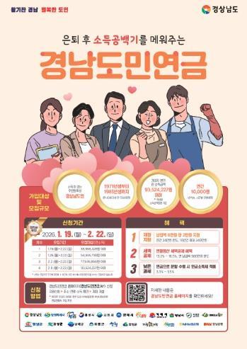 [한국제일신문, 김성옥기자] 사천시는 오는 1월 19일부터 ‘2026년 경남도민연금 지원사업’ 가입 신청을 받는다고 15일 밝혔다.