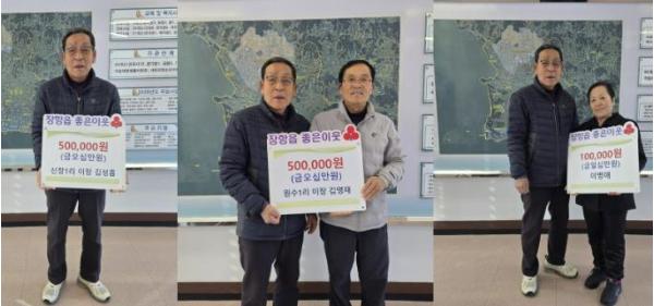 이번 후원에는 김성흠 신창1리 이장이 50만원, 김영재 원수1리 이장이 50만원, 이병애 씨가 10만원을 기부해 총 110만원의 성금이 모였다.