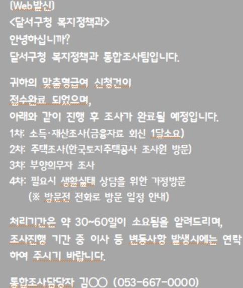 이에 달서구는 2024년부터 알림톡 서비스를 도입해, 구청 통합조사팀에서 신청 서류를 확인한 후 신청인에게 조사 담당자, 조사 기간 및 절차 등을 알림톡으로 안내하고 있다.