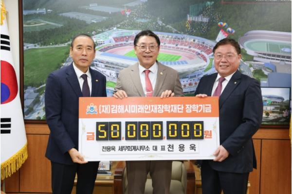 [한국제일신문, 김성옥기자] 김해시미래인재장학재단은 15일 천용욱 세무회계사무소에서 올해부터 5년간 5,000만원을 기탁하기로 했다고 밝혔다.