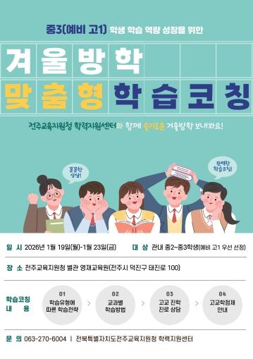 [한국제일신문, 윤진성기자] 전북특별자치도전주교육지원청은 학교급 전환기를 맞은 중학교 3학년 학생들의 학습 공백을 최소화하고, 성공적인 고등학교 안착을 돕기 위해 ‘겨울방학 맞춤형 학습코칭’을 운영한다고 15일 밝혔다.