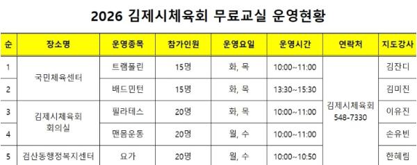 또한, 김제시체육회는 배드민턴, 필라테스, 맨몸운동, 요가 등 자체 프로그램을 개설하여 김제시민 누구나 참여 가능 하도록 했으며, 기존의 생활체육 프로그램 외에 트램폴린 및 소도구 필라테스 운동을 통해 매우 효율적으로 근력 및 유산소운동을 할 수 있어 생활체육활동의 즐거움을 높여주고 있다.