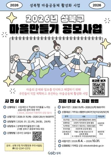 [한국제일신문, 김성옥기자] 서울시 성북구는 마을공동체 활성화를 위해 '2026년 성북구 마을만들기 공모사업'을 진행한다.
