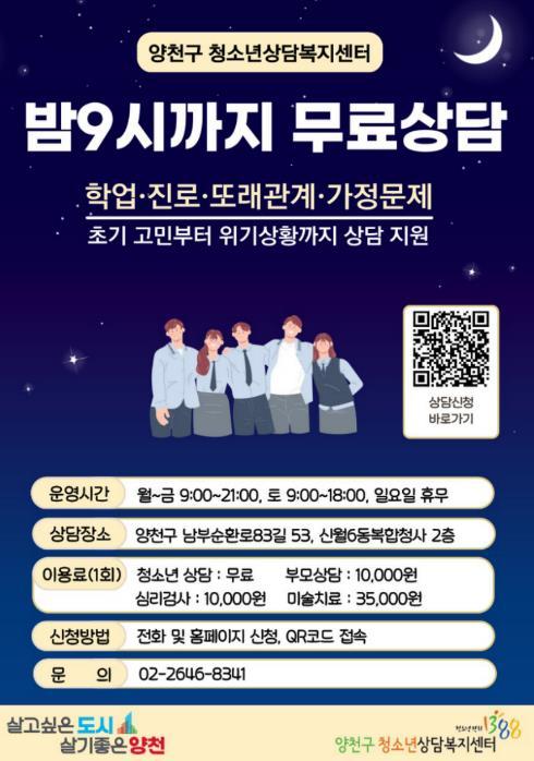 [한국제일신문, 김영배기자] 양천구가 심리적·정서적 어려움을 겪고 있는 청소년의 건강한 성장을 돕기 위해 마음건강 지원 강화에 나섰다. 올해부터 청소년상담복지센터 개인상담 서비스를 전면 무료화하고, 평일 밤 9시까지 연장 운영에 돌입한다.