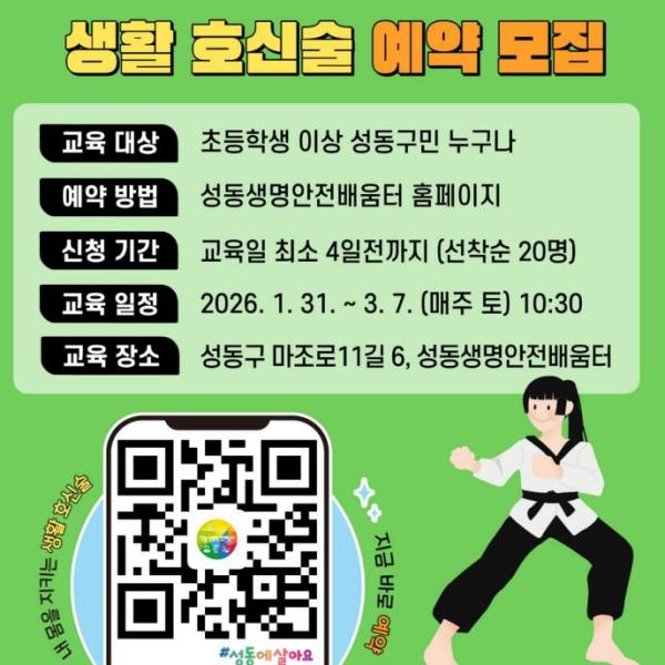 [한국제일신문, 김성옥기자] 서울 성동구가 구민의 생활 안전 역량 강화를 위해 성동생명안전배움터에서 ‘2026년 생활 호신술 안전교육’을 운영한다.