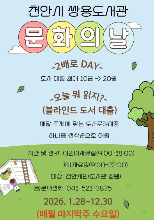 [한국제일신문, 김성옥기자] 천안시 쌍용도서관은 매달 마지막주 수요일 ‘2026 문화가 있는 날’ 행사를 운영한다고 16일 밝혔다.