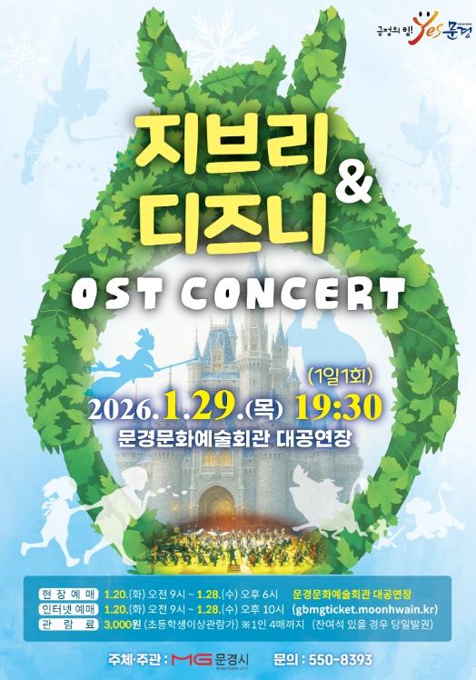 [한국제일신문, 김성옥기자] 문경문화예술회관에서는 신년 겨울 방학을 맞아 인기 애니메이션 대표곡들을 들려주는 지브리 ·디즈니 OST 콘서트 공연을 1월 29일 19:30 (1일 1회)에 문경문화예술회관 대공연장에서 개최한다.