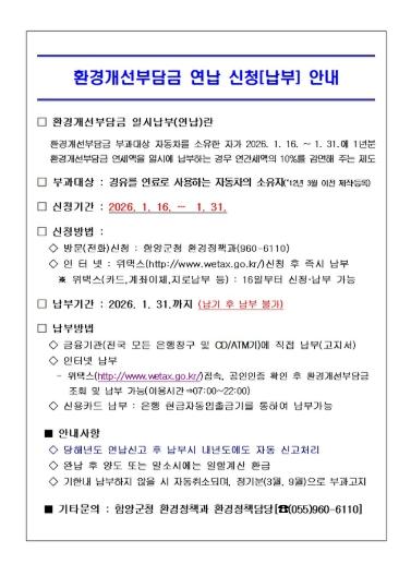 [한국제일신문, 김성옥기자] 함양군은 경유를 연료로 사용하는 자동차(2012년 3월 이전 제작·등록에 한함)에 매년 3월과 9월 부과되는 환경개선부담금의 일시 납부(연납)를 1월 31일까지 접수 받고 있다.