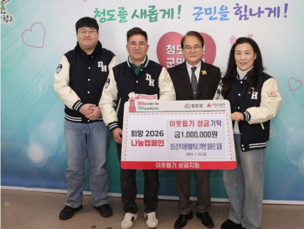 [한국제일신문, 김성옥기자] 대구한의대학교 청도인적자원개발학과 3학년 임원진들(과대표 조형석)은 지난 16일 희망2026 나눔캠페인 이웃돕기 성금 100만원을 청도군에 전달했다.
