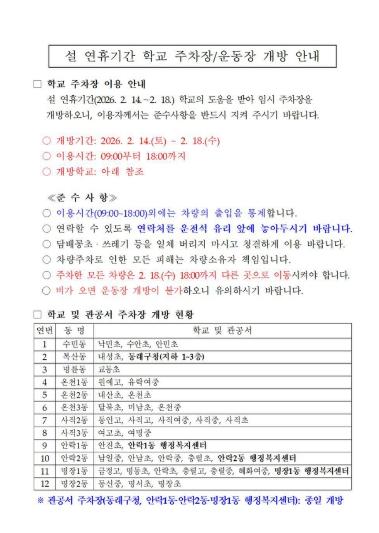 [한국제일신문, 김성옥기자] 부산 동래구는 설 연휴 기간 귀성객의 주차 편의를 위해 2월 14일부터 18일까지(5일간) 학교 및 관공서 37개소의 주차장 또는 운동장을 임시 개방한다고 밝혔다.