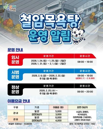 태백시 관계자는 “임시·시범운영 기간 동안 실제 이용 과정에서 나타나는 불편 사항과 개선 의견을 충분히 반영한 후 정상운영에 들어갈 계획”이라며, “철암목욕탕이 지역 주민들의 건강 증진과 생활 편의를 높이는 대표적인 공공복지시설로 자리매김할 수 있도록 최선을 다하겠다”고 말했다.