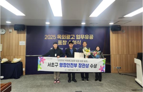 [한국제일신문, 김성옥기자] 서울 서초구는 지난해 12월 29일 행정안전부가 주관한 '옥외광고업무 평가'에서 행정안전부장관상을 수상했다고 밝혔다. 이번 수상은 서울시 25개 자치구 가운데 유일한 성과로, 불법광고물 정비는 물론 예방·협업·지원 정책 전반에서 뛰어난 행정 역량을 인정받은 결과로 풀이된다.