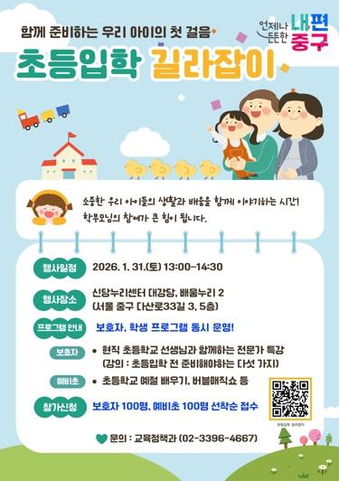 [한국제일신문, 김성옥기자] 서울 중구가 ‘2026 초등입학 길라잡이’ 설명회를 오는 31일 오후1시부터 신당누리센터 대강당에서 개최한다. 예비 초등학생과 학부모를 대상으로 약 1시간 반 동안 현직 교사가 첫 학교생활에 대한 궁금증을 해소해 줄 예정이다.