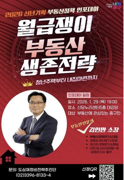 [한국제일신문, 김성옥기자] 서울 중구가 급변하는 부동산 환경 속에서 주민들의 현실적인 대응 전략을 돕기 위해 오는 29일 저녁 7시 신당누리센터 5층 대강당에서 올해 첫 도시런(learn) 스쿨‘신년기획 부동산 전략 인포(INFO)데이’를 연다.