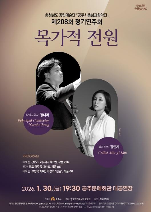 [한국제일신문, 김성옥기자] 충청남도 공립예술단 공주시충남교향악단은 오는 1월 30일19시 30분, 공주문예회관 대공연장에서 ‘목가적 전원’을 부제로 2026년 시즌의 첫 정기공연의 문을 연다.