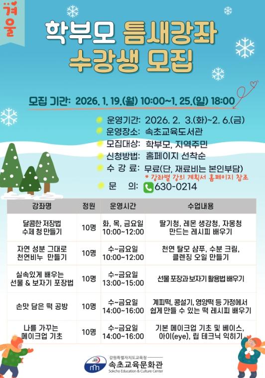 [한국제일신문, 김성옥기자] 속초교육문화관은 3월 정규 강좌 개강에 앞서 학습 공백기를 활용한 학습 기회를 제공하고자, 2월 3일부터 6일까지 학부모와 지역주민을 대상으로 ‘겨울 학부모 틈새강좌’를 운영한다.