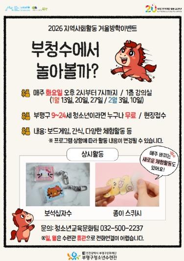 [한국제일신문, 김성옥기자] 부평구 청소년수련관은 오는 20일부터 다음달 10일까지 겨울방학을 맞아 지역 청소년을 위한 2026 지역사회활동 겨울방학 이벤트 ‘부청수에서 놀아볼까’를 진행한다.