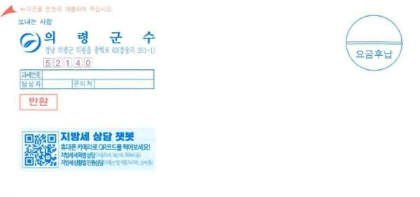 [한국제일신문, 김성옥기자] 의령군은 지방세 고지서 전면에 ‘지방세 챗봇 상담서비스’ QR코드를 삽입해 발송한다고 밝혔다.