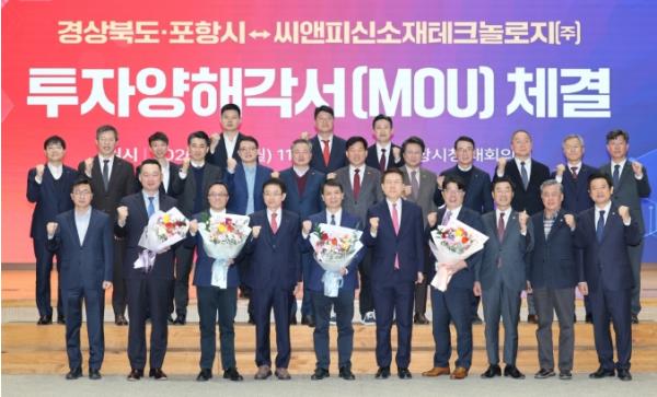 [한국제일신문, 김성옥기자] 포항시와 경상북도는 19일 포항시청 대회의실에서 씨앤피신소재테크놀로지㈜와 5,000억 원 규모의 투자양해각서(MOU)를 체결했다.