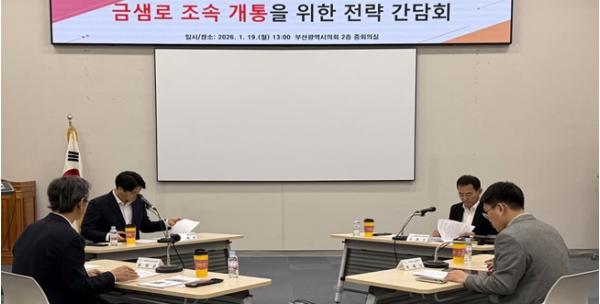 [한국제일신문, 김성옥기자] 부산광역시의회 이준호.이종진 의원은 1월 19일 오후 1시, 시의회 중회의실에서 '금샘로 조속 개통을 위한 전략 간담회'를 개최했다. 이번 간담회는 산성터널 접속도로 미개설 구간인 금샘로 공사의 지연 원인을 점검하고, 조속한 사업 추진을 위한 실질적인 해결 방안을 모색하기 위해 마련됐다.