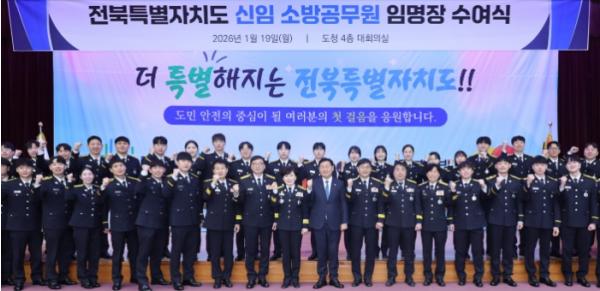 [한국제일신문, 윤진성기자] 전북특별자치도는 19일 도청 4층 대회의실에서 2026년 신임 소방공무원 임명장 수여식을 열고, 도민의 생명과 안전을 지킬 신임 소방공무원 45명을 공식 임명했다.