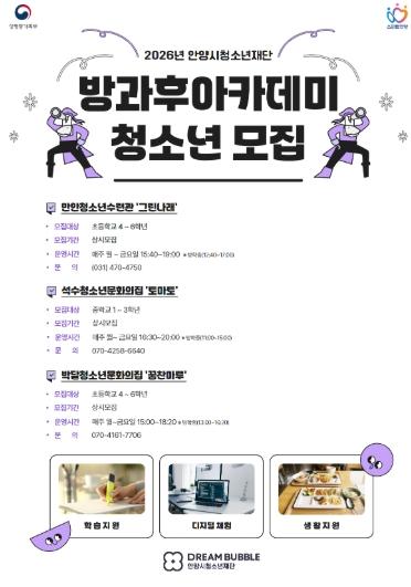 [한국제일신문, 김성옥기자] 안양시청소년재단은 공공 청소년 돌봄 사업인 청소년방과후아카데미의 2026년도 참여 청소년을 모집한다.