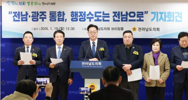 나광국(더불어민주당·무안2)은 1월 19일 13시 30분 전남도의회 브리핑룸에서 기자회견을 열고, “향후 출범할 통합 지자체의 행정청사와 자치단체장의 근무지는 반드시 현재 전남도청이어야 한다”고 강력히 주장했다.