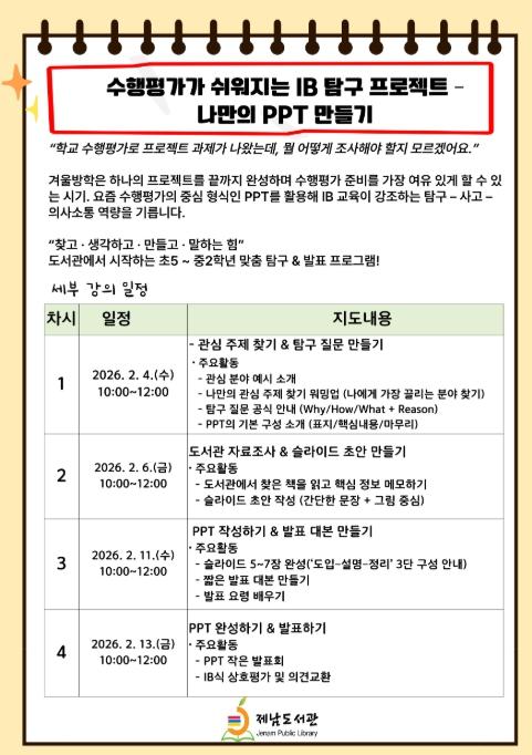 제남도서관 관계자는 “이번 프로그램을 통해 학생들이 스스로 주제를 정하고 탐구하는 경험을 쌓음으로써 자기주도적 학습 역량을 기르고 학교 수행평가와 발표 수업에 대한 자신감을 높이는 계기가 되길 바란다”고 말했다.