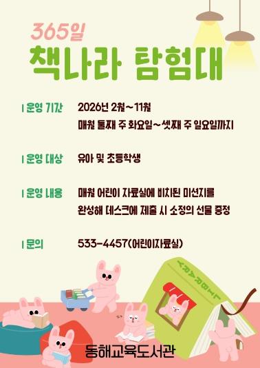 동해교육도서관(관장 안은희)은 어린이들의 독서 흥미를 높이고 도서관 방문을 활성화하기 위해 어린이 독서활동 프로그램 ‘365일 책나라 탐험대’를 운영한다고 밝혔다.