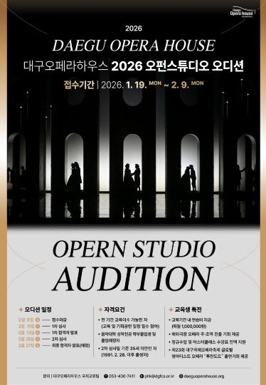 정갑균 대구오페라하우스 관장은 “대구오페라하우스는 성장 가능성이 높은 젊은 성악가들이 세계 무대에 설 수 있도록 발굴부터 육성까지 체계적인 지원을 이어가고 있다”며 “2026 오펀스튜디오 오디션을 통해 재능 있는 신예 성악가들의 많은 관심과 참여를 기대한다”고 말했다.
