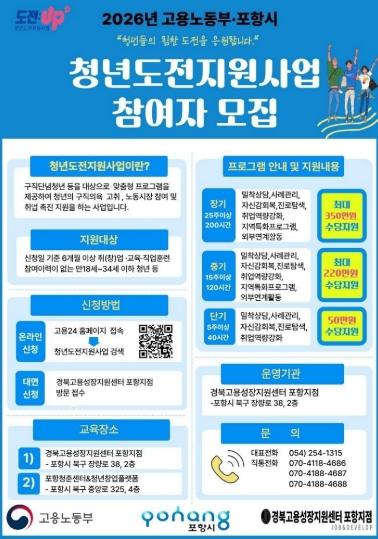 [한국제일신문, 김성옥기자] 포항시는 장기간 미취업 상태이거나 구직에 어려움을 겪는 청년들의 노동시장 복귀를 지원하기 위해 ‘2026 청년도전지원사업’ 참여자를 선착순 모집한다.