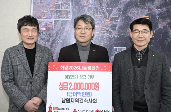 [한국제일신문, 이미란기자] 남원시는 지난 20일, 남원지역건축사회가 ‘희망 2026 나눔 캠페인’에 성금 200만 원을 기부했다고 밝혔다.