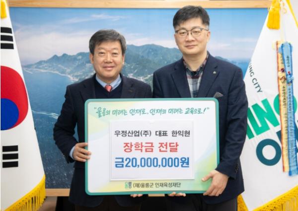 [한국제일신문, 김성옥기자] 지난 20일 화요일 오전 9시, 울릉군청을 방문한 우정산업(주)는 (재)울릉군인재육성재단(이사장 남한권)에 장학금 2,000만 원을 기탁했다.