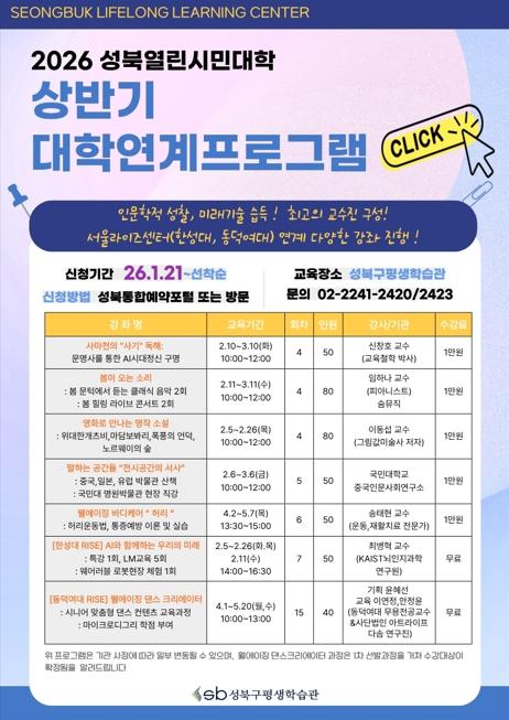 구 관계자는 “열린시민대학은 단순한 강좌를 넘어 구민이 시대 변화에 대응하고 삶의 방향을 함께 고민하는 학습 플랫폼”이라며 “앞으로도 평생학습도시 성북의 위상을 높일 수 있도록 내실 있는 프로그램을 운영하겠다”고 밝혔다.