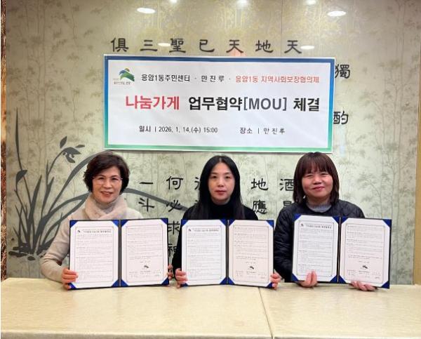 [한국제일신문, 김성옥기자] 서울 은평구 응암1동은 지난 14일 관내 음식점 ‘만진루’와 지역사회 나눔문화 확산을 위한 ‘우리동네 나눔가게’ 업무협약을 체결했다고 밝혔다.